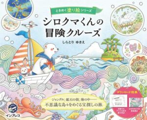 This is the 7th book in the “Tokimeku Coloring Book Series”. According to the publisher’s blurb “the theme of this work is the sea and fairy tale adventure. Polar bears, snow rabbits, foxes, chipmunks, and a variety of other animals and cute and mysterious creatures appear. Tour through unique islands such as snow islands, jungles, caves, and glittering ore towns, and finally go underwater.” You will also receive a link where you can download a colored inspirational image and a free PDF of the illustrations that you can download and print out.