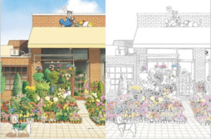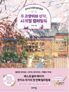This is the first coloring book by Korean illustrator, Pan Ji-soo. The coloring book features 4 chapters for each season. Each season features “Toni and Toru, two cats who live with him” as they venture out and guide the colorist through the streets of Seoul primarily through the seasons. The book features colored illustrations to inspire you and on the facing page the line art. Some illustrations have some pre-printed coloring on the line art. illustrations.