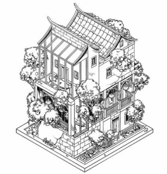 This coloring book features houses and buildings in a fantasy world.