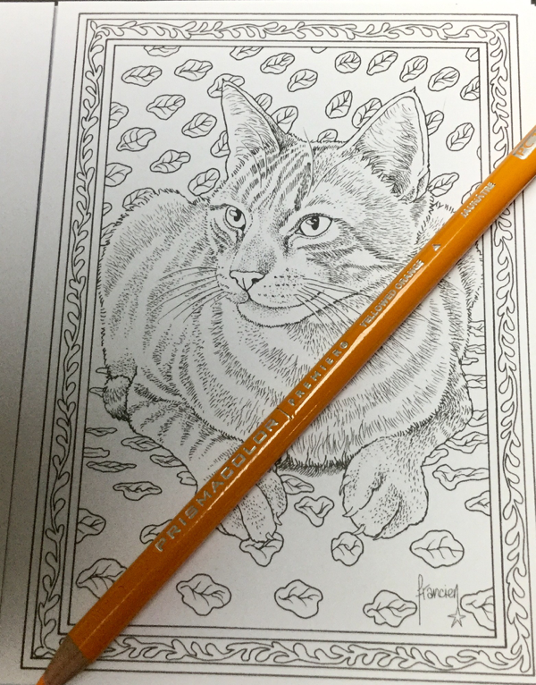 A lovely reader recommended Francien van Westering’s coloring books to me a while ago. Francien creates beautifully illustrated cat coloring books among her many talents. I was able to locate this Dutch artist’s larger sized coloring book featuring an array of gorgeous cats easily enough, and reviewed it a while ago. However, the small set of cat coloring postcards proved more difficult, with the cards being out of stock for a little while. Fortunately, my kitty cat postcards finally arrived and are now cuddled on the shelf with the larger book.